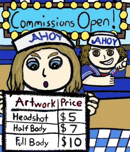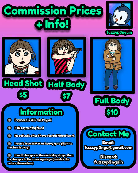 First get the following info: Character you want drawn (provide reference if needed), the pose + expression, outfit, and any other small details.Then with that information, choose one of the following options to share that with me and get your commission started: DM me on discord (fuzzyp3nguin) or email [email protected].